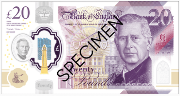 حالياً توجد صورة الملكة إليزابيث على أحد وجهي العملة النقدية، وكذلك داخل العلامة المائية الموجودة على هذه العملة، وستحل صورة تشارلز الثالث محل صورة والدته في كلا هذين المكانين، بحسب نماذج كشفت النقاب عنها المؤسسة النقدية.