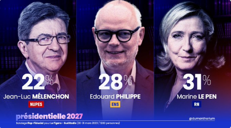 وستحصل لوبن حسب الاستطلاع الذي نشرت نتائجه الأربعاء، على 31 بالمئة من الأصوات إذا جرت الدورة الأولى من الانتخابات الرئاسية الأحد المقبل، في حال ترشح زعيم اليسار الراديكالي جان لوك ميلينشون (22 بالمئة) وحده عن اليسار، رئيس الوزراء الأسبق إدوار فيليب عن الأغلبية الرئاسية (28 بالمئة).