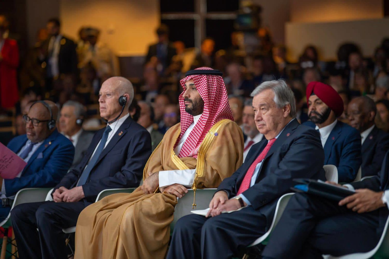 الأمير محمد بن سلمان يتوسط أمين عام الأمم المتحدة والرئيس التونسي خلال الجلسة (واس)