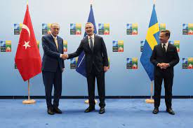 شبكة المدارالإعلامية الأوروبية…_اتفق رئيس المجلس الأوروبي شارل ميشال والرئيس التركي رجب طيب اردوغان الاثنين على السعي لتعاون أوثق بعدما طالب الزعيم التركي باستئناف محادثات انضمام بلده إلى الاتحاد الأوروبي. من جانبه قال الأمين العام للناتو ينس ستولتنبرغ إن أردوغان وافق على تأييد انضمام السويد إلى حلف شمال الأطلسي.