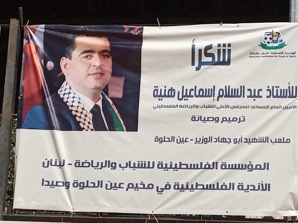 مشروع ترميم أرضية ملعب “الشهيد أبو جهاد الوزير” في مخيم عين الحلوة (بالقرب من مدينة صيدا اللبنانية) بدعم ورعاية الأمين العام المساعد للمجلس الأعلى للشباب والرياضة الفلسطيني “الأستاذ عبد السلام هنية ابو إسماعيل”.