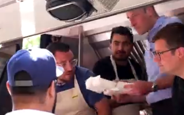 الأمير قال أثناء تقديمه البرغر لزبائن بدا عليهم الذهول: “سأحضر (البرغر) حالاً (…) صباح الخير على الجميع. إنه مطبوخ بشكل جيد وجاهز للاستلام”.