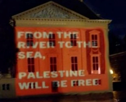 شبكة المدارالإعلامية الأوروبية…_قام نشطاء من الحزب السياسي BIJ1 بعرض الشعار المناهض لإسرائيل: “من النهر إلى البحر، فلسطين ستتحرر” على متحف موريتشويس في دانهاخ، تخطط المشاورة اليهودية المركزية (CJO) لتقديم تقرير للشرطة، ويعتبر الشعار معادياً للسامية لأنه ينكر حق إسرائيل في الوجود.