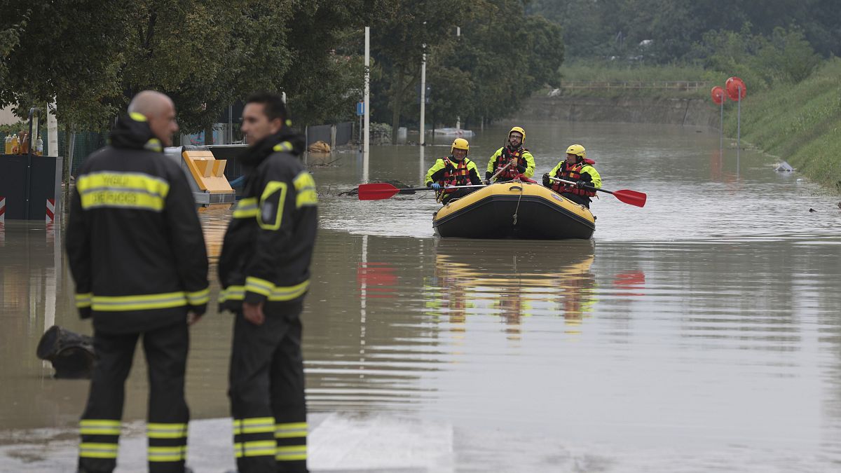 فيديو. بدأت فرق الإطفاء في إيطاليا جهود الإنقاذ في منطقة إميليا رومانيا، بعد أن تسببت الأمطار الغزيرة في فيضانات عارمة وارتفاع منسوب الأنهار يوم الجمعة.