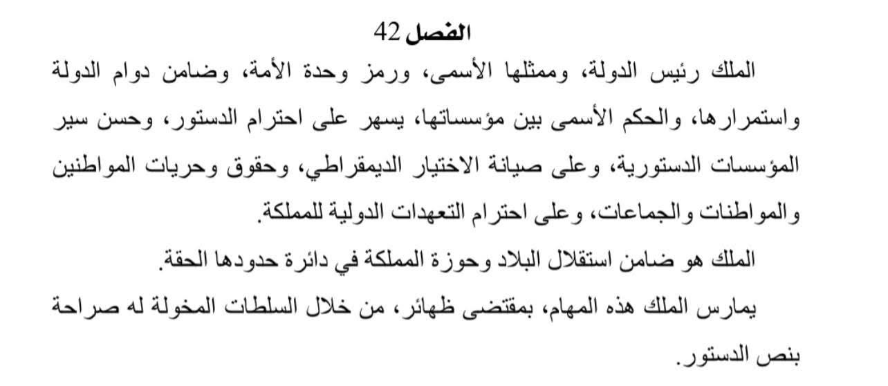 إن وجود الفصل 42 داخل الهندسة الدستورية كبديل عن الفصل 19 من دستور 1996، الذي كان إلغائه مطلبا للنخب السياسية ، التي مع كامل الآسف، لم تكن في مستوى اللحظة. يعد اليوم مخرجا دستوريا لتجاوز أي عرقلة أو فشل للعملية السياسية، سواء تعلق الأمر بعدم قدرة الحزب الحاصل على أكبر عدد من الأصوات في تشكيل حكومة ، كما هو الحال في تجربة تعيين السيد عبد الإله بنكيران رئيسا للحكومة ثم إعفائه واستبداله بالسيد سعد الدين العثماني، أو عندما يتعقل الأمر بتجواب ملكي مع مطالب شعبه نتيجة ضعف الأداء الحكومي، أو فشل في التدبير أو بفعل أي صراع بين المؤسسات قد يؤدي إلى تعطل سيرها.